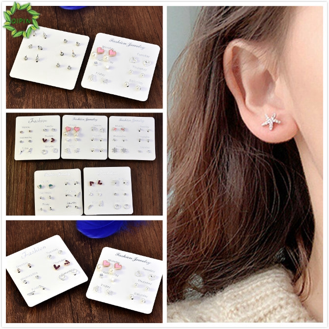Cod Qipin Set 6 đôi khuyên tai đính đá thời trang cho nữ free ship